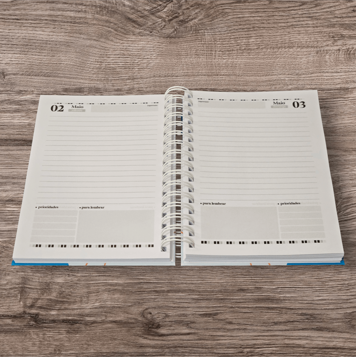 Com formato A5, é compacta e fácil de transportar na bolsa ou mochila, mantendo sempre à mão todas as tarefas, compromissos e anotações importantes. A agenda segue o modelo 1DPP (um dia por página), oferecendo amplo espaço para escrever e organizar a rotina. Os dias da semana possuem páginas individuais, com exceção de sábado e domingo, que compartilham uma mesma página — tornando o uso mais prático e funcional.